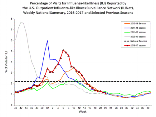 Another possibility why you may feel under the weather after getting a flu shot is that you were exposed to another respiratory illness in the days before you got the shot and now you’re sick with that. Coincidences like that are unfortunate, but do make sense with the timing of when respiratory diseases really kick off. Above is a time series graph showing the number of visits to an outpatient healthcare provider for influenza-like illness (ILI) each week from 2015-present (as reported to ILINet).