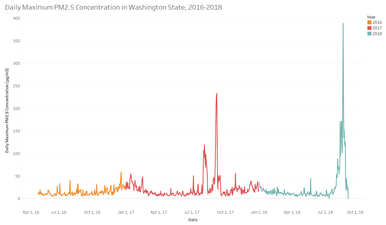 The graph above shows the daily maximum PM2.5 concentration for Washington State between May 2016 and the beginning of September 2018 with the years in yellow, red, and blue. As you can see, the maximum daily PM2.5 spikes in the last two summers and our highest spike in 2018 (389 µg/m3) was more than 1.6 times as high as the previous summer (233.3 µg/m3).