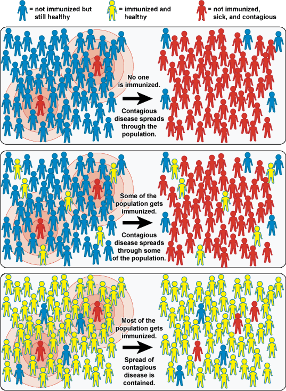 An illustration of how diseases move more slowly in communities with a higher percentage of immune individuals, demonstrating how herd immunity works. Via The Conversation